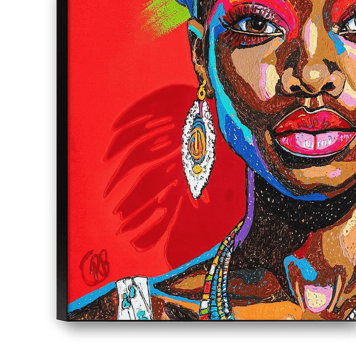 Dit schilderij spreekt direct tot het hart. "Oog van het Tropenlicht" is niet zomaar een portret — het is een spiegel van innerlijke kracht en schoonheid. Voor wie zichzelf herkent in krachtige kleuren, intense blikken en een diep gevoel van eigenwaarde is dit werk een dagelijkse inspiratiebron. Een echt statement piece voor elke ruimte waar kracht, elegantie en kleur samen mogen komen.