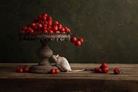 Een sfeervol stilleven met een witte muis en rode sierappeltjes.