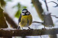 Deze foto toont een pimpelmees die recht in de camera kijkt, vastgelegd in een moment van volledige aandacht. Het kleine formaat van de vogel staat in contrast met de intensiteit van de blik, waardoor het beeld voelt als een korte, stille ontmoeting. De zachte achtergrond en het natuurlijke licht houden de compositie rustig en…