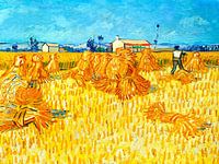 Oogst in de Provence, waarschijnlijk ter plaatse kort voor 20 juni 1888 geschilderd, toont een fragment van het plattelandsleven zoals Vincent van Gogh het op een bepaalde zomerdag in zijn vijfendertigste jaar beleefde. Het schilderij roept een toestand van verandering op: de penseelstreken in de lucht worden omver geblazen door een nerveuze zomerwind; de lijn van de horizon golft onder zonnewarmte; de volle boerderijgebouwen in de verte verlangen ernaar gevuld te worden met natuurproducten; en op de voorgrond dansen de bundels maïs in de wind als een laatste afscheid van hun aardse verblijfplaats. De aanwezigheid van de mensheid op de foto is beperkt tot een eenzame landarbeider die met een paar verfstreken wordt aangegeven. Maar als geheel is oogst in Provence een lofzang op het menselijk leven.