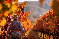 Omringd door een zee van gouden en rode wijnbladeren, werkt een wijnboer nauwgezet onder een warme herfstzon. Deze scène, diep geworteld in de rijke tradities van de wijnbouw, spreekt tot de toewijding en de ambachtelijke vaardigheid die nodig zijn om de vruchten van de natuur te cultiveren. Terwijl de zon de levendige kleuren van de…