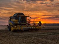 Maaidorser oogst de tarwe van het veld tijdens de ondergaande zon.