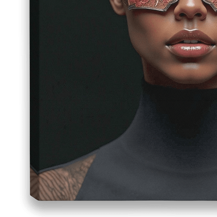 De foto toont een indrukwekkend, hyperrealistisch portret van een vrouw die een krachtig masker draagt. De titel beschrijft perfect het centrale ontwerpelement van het masker: twee gestileerde, vleugelachtige uitsteeksels van rood en goud metaal die boven haar ogen uitsteken. Het masker is een meesterwerk van vakmanschap. De kleuren…