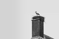 Ooievaar op nest in de schoorsteen bij slot Zuylen in Utrecht. Zwart-wit foto van zomer 2017.