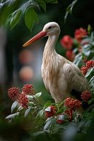 ooievaar op een tak met bloemen, wildlife in de natuur. Close up van een ooievaar met lange rode snavel die zijdelings in de verte kijkt.
