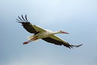 Witte ooievaar vliegt in de blauwe lucht en toont zijn vleugels