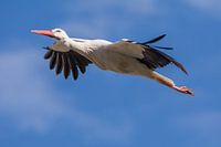Een witte ooievaar zweeft op een zonnige dag voor een blauwe hemel.