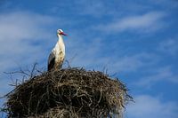 Deze ooievaar wacht op het nest tot haar partner thuiskomt of zit gewoon op de uitkijk.