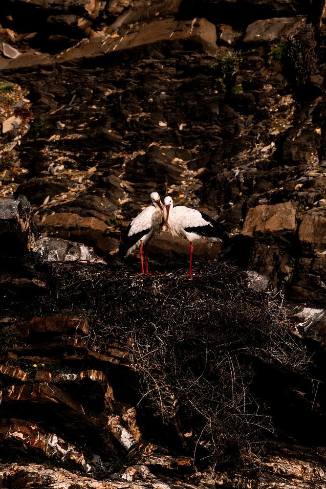 Deze dramatische foto toont twee ooievaars die samen balanceren op een imposante rotswand, genesteld in een zorgvuldig opgebouwd nest van takken. Het contrast tussen de witte veren en de donkere, textuurrijke achtergrond van gelaagd gesteente creëert een krachtig visueel statement. De intieme houding van de vogels straalt rust, verbondenheid en bescherming uit — een zeldzaam moment van tederheid in een ruige natuurlijke omgeving. Dit werk spreekt tot de verbeelding van natuurliefhebbers en fotografen die geïnspireerd zijn door harmonie in contrast.