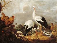 Ooievaars, wilde eenden, kippen, een reiger, een kikker en andere vogels in een rivierlandschap, Melchior d'Hondecoeter