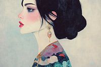 Oorbel Vrouw | Elegante Dame Watermotief - In dit moderne vrouwenportret zie je een jonge vrouw met een opvallende gouden oorbel die tegen een zachte blauwe achtergrond staat; ze draagt een blouse met een subtiel patroon van water en rode vissen.