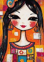 Oorbellen - Dit kleurrijke vrouwenportret-schilderij laat een vrolijke vrouw zien met opvallende oorbellen en een spiraalvormige haarspeld op een achtergrond van levendige, abstracte patronen.