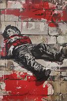 Dit aangrijpende kunstwerk toont een kind, vredig slapend te midden van de chaos van stedelijke graffiti. Het contrast tussen de onschuld van de jeugd en de rauwe realiteit van de straatkunst roept een krachtige emotie op. De rode accenten symboliseren zowel gevaar als passie, waardoor een gevoel van urgentie en hoop ontstaat. Dit stuk is een krachtig statement over de veerkracht van de menselijke geest en de schoonheid die zelfs in de meest onverwachte plekken kan worden gevonden.