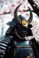 Een fascinerende aanwezigheid in een majestueus harnas dat opvalt met zijn gouden embleem en opvallende hoorns. Omringd door delicate kersenbloesems straalt deze figuur zowel kracht als elegantie uit. Ideaal voor een woonkamer, het wordt een gespreksonderwerp en voegt een uitzonderlijke culturele touch toe aan elke kamer.
