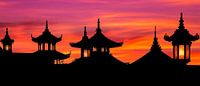 De silhouetten van traditionele pagodes ontvouwen zich in zachte overgangen van violet en oranje en stralen een mystieke rust uit. Deze harmonieuze compositie creëert een uitnodigende sfeer, vooral in een woonkamer, die kan inspireren tot ontspannende gesprekken en dromerige gedachten. Ideaal voor een time-out in een oosterse sfeer.
