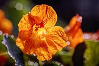Dauw op deze oranje Oost Indische Kers in het tegenlicht