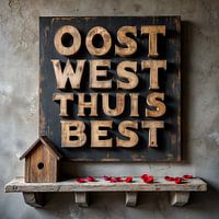 Tegen een ruw betonnen muur hangt een bord met de tekst **Oost West Thuis Best**, gevormd door verweerde houten letters.