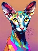 Oosters Korthaar pop-art is een levendige en gedurfde artistieke stijl die de unieke kenmerken van het Oosters Korthaar ras laat zien. Deze pop-artstijl benadrukt vaak het lange, elegante lichaam, de grote oren en de gladde vacht van de kat in overdreven kleuren en patronen. Het vangt de speelse en energieke persoonlijkheid van het ras op een leuke en opvallende manier.