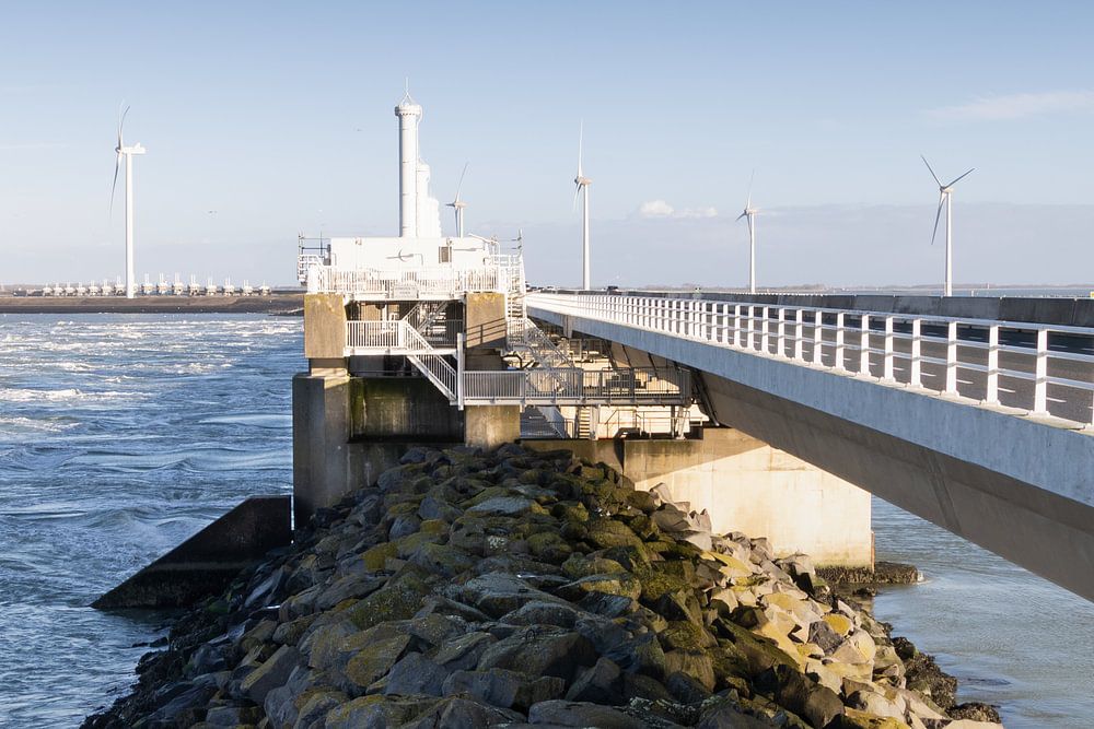 Een foto van de Oosterschelde Stormvloed Kering die Zeeland beschermd tegen overstromingen zoals in 1953. Een prachtig bouwwerk gefotografeerd op een mooie zonnige dag.