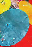 Een mengsel van oosterse parasols, bestaande uit een blauwe, twee gele en een roze Japanse parasol. De parasols zijn helder en kleurrijk, gemaakt van geolied papier en versierd met traditionele bloemenafbeeldingen. Zoals te zien is aan de roze parasol op de achtergrond, hebben de parasols een bamboestructuur.