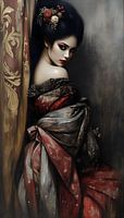 Laat je betoveren door onze kunstprint "Oosterse geheimen". Dit prachtige schilderij toont een vrouw in een traditionele Japanse kimono, gekleed in rijke, diepe tinten van rood en grijs. Haar serene uitdrukking en subtiele, gedetailleerde make-up stralen een gevoel van mysterie en verfijning uit.