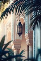 Een zachte gloed van licht danst op sierlijk versierde muren, terwijl een filigraan lantaarnhanger in oosterse stijl mysterieuze schaduwen werpt. Weelderige planten omlijsten de architectuur en geven het tafereel een exotisch tintje. Deze scène nodigt je uit om de verhalen van een ver land te voelen en de magie van vervlogen tijden.