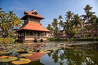 Hindoeïstische tempel in Kochi, Keral, India. Houten tempel tussen de palmbonen. Meer vol met lelieplanten.