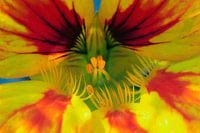 Een kleine bloem van de oostindische kers. De bloem is klein. Deze was ongeveer 2 centimeter in doorsnee, en verscheen zomaar in de tuin, laag bij de grond. Ik lag dus op de zij en op mijn buik om de binnenkant deze bloem goed vast te leggen. Hier zijn de stempels goed zichtbaar in de ingewanden van de bloem.