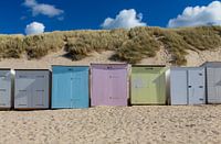 Strandcabines Oostkapelle, Zeeland, Nederland. Het zand van het strand, het rijtje witte strandhuisjes met in het midden de gekleurde cabines met de duinrug en de strak blauwe lucht en witte wolken er achter leverde een mooi zomers en kleurrijk beeld op.