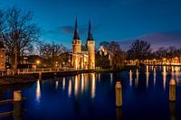 Oostpoort van Delft verlicht, vlak na zonsondergang met een mooie blauw lucht waarin ook paarse tinten zitten