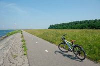 Almere The Netherlands Cycle path leading into the distance along the Oostvaardersdijk, dike separating the reclaimed land of Flevoland from the Markermeer.