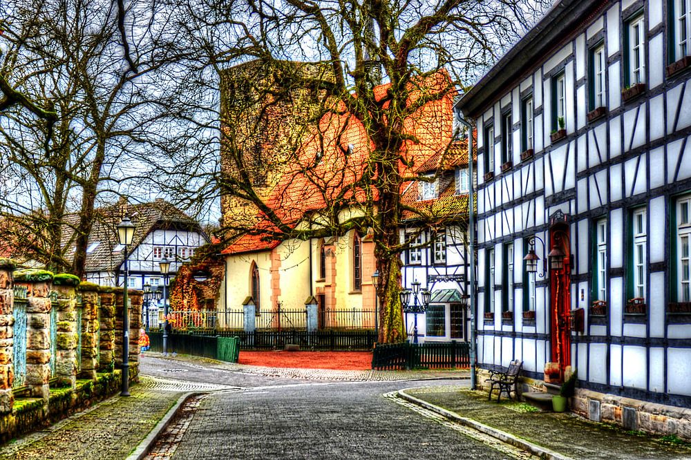 Vakwerkhuizen in de historische oude binnenstad van " Alten Freiheit Westerholt" in Herten