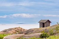 Oostzeekust met rotsen en houten hut bij Oskashamn in Zweden.