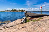 Oostzeekust met rotsen en steiger op het eiland Sladö in Zweden.