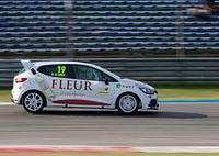Een foto van een Clio Cup race auto die door de bocht gaat op 3 wielen.