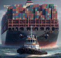 Containerreus wordt de haven van Hamburg binnengesleept.