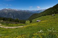 Uitzicht vanaf Hirzer over bloeiende weiden en de Dolomieten