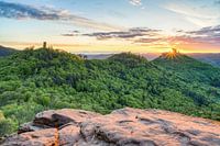 Uitzicht vanaf Slevogt-rots in de richting van de ruïne Scharfenberg, de ruïne Anebos en het kasteel Trifels bij zonsondergang.