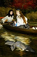 Toen James Tissot in 1871 als politiek vluchteling naar Engeland vluchtte na de Frans-Pruisische oorlog, ontdekte hij dat de Engelse verdenking van Franse schildertechniek en een voorkeur voor sentimentele vertelling hem zou dwingen zijn werk aan te passen voor de Britse markt. In On the Thames, A Heron, een van zijn eerste Engelse werken, creëerde Tissot een succesvol amalgaam van deze twee esthetica door de Britten zijn Franse techniek te serveren, verpakt in de zoete Victoriaanse charme van mooie jonge vrouwen die op de Theems varen. Ook wordt hier het volledige begrip van de kunstenaar van de esthetiek van het Japanse design in zijn gebruik van een hoog standpunt en de juxtapositie van twee afzonderlijke picturale elementen in de gecomprimeerde ruimte gepresenteerd. Verder suggereert het momentane realisme en de kadrering van de compositie ook de invloed van de fotografie.