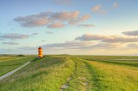 Uitzicht langs de dijk naar de vuurtoren van Pilsum. De vuurtoren is een herkenningspunt van Oost-Friesland en is vooral bekend uit de film "Otto - der Außerfriesische". Het is dan ook een van de bekendste vuurtorens van Duitsland.