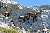 In de ruige hoogten van de Franse Alpen staat een steenbok op een rots, zorgvuldig wakend over zijn twee jongen.
