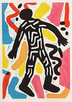 Dit abstracte kunstwerk met de titel "At the Crime Scene" vangt de dynamische en chaotische energie van een onderzoekslocatie. Het zwarte silhouet van een menselijke figuur met witte lijnen lijkt op de vorm die vaak wordt aangetroffen op een plaats delict en roept een gevoel van mysterie en spanning op. Rondom de figuur zijn levendige, kleurrijke vormen te zien in rood, geel, blauw, roze en oranje tegen een strakke witte achtergrond. Deze kleuren symboliseren de gefragmenteerde emoties en elementen die aanwezig zijn in de nasleep van een gebeurtenis en creëren een krachtig contrast tussen de plechtige figuur en zijn levendige omgeving. De compositie nodigt kijkers uit om na te denken over de wisselwerking tussen orde en wanorde, leven en verlies.