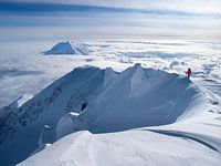 Een alpinist loopt alleen over de sneeuwgraat die naar de top van de Denali voert. Deze berg, vroeger Mount McKinley genoemd, ligt in Denali National Park in Alaska en is de hoogste berg van Noord Amerika. Op de achtergrond steekt de top van Mount Foraker uit de wolken.