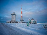 Deze foto toont het Brockenhotel, de Brocken zendmast en het Brockenhaus. De foto is kort na zonsopgang genomen.