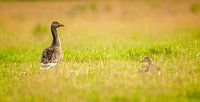 Een grauwe gans (Anser anser) staat op de uitkijk, terwijl een ander tussen het gras ligt.
