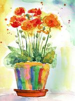 Aquarel van een gestreepte bloempot met oranjerode klaprozen.