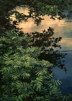 Je ziet de begroeide oever van een rivier op een broeierige zomeravond. Het warme licht van de avondzon wordt via wat wolkjes weerkaatst in het water. Het ritselt in de struiken en af en toe nemen de krekels even pauze om vervolgens het volume weer open te gooien.