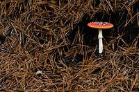 De bekendste paddenstoel die er bestaat (denk ik): de vliegenzwam. Dit exemplaar was nog prachtig en ongeschonden en werd door de herfst omringd door gevallen, verkleurde dennennaalden.