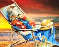 Aquarel van een jong meisje dat heerlijk uitrust op een zonnige  namiddag op een ligstoel.