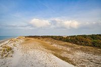 Op het strand van de Baltische Zee, met duinen. Grote zandduinen die zich uitstrekken langs de kust. Zandstrand en zee. Landschapsopname bij de zee